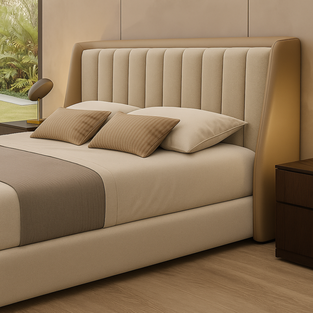 السرير يتميز بقماشين الكتان لكامل السرير وجوانب الرأس بقماش الجلد