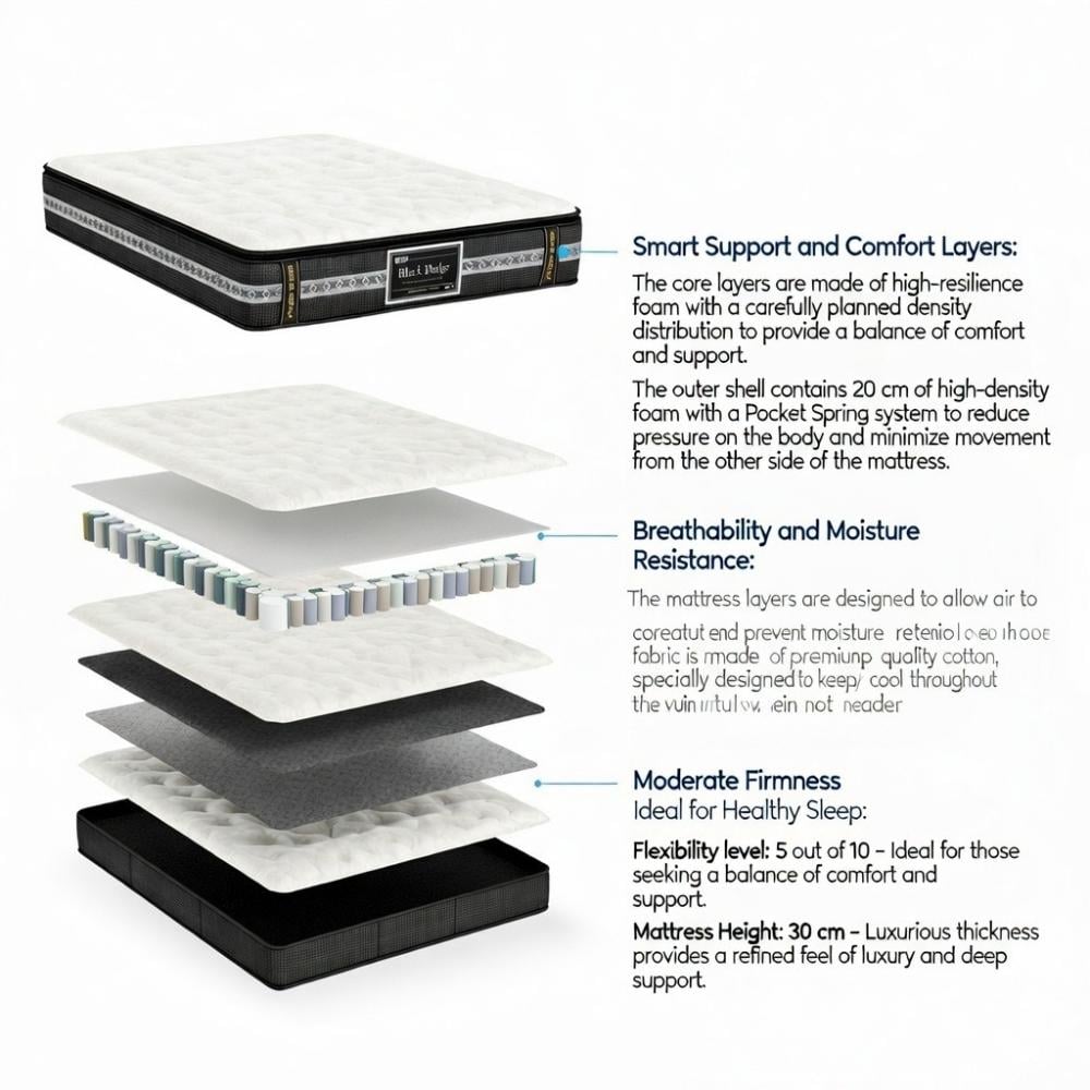 تم تصميم مرتبة بلاك بادج بطبقات دعم وراحة ذكية تجمع بين الإسفنج عالي المرونة ونظام النوابض الجيبية (Pocket Spring)، لتوفير توزيع متوازن للوزن وتقليل الضغط على الجسم.