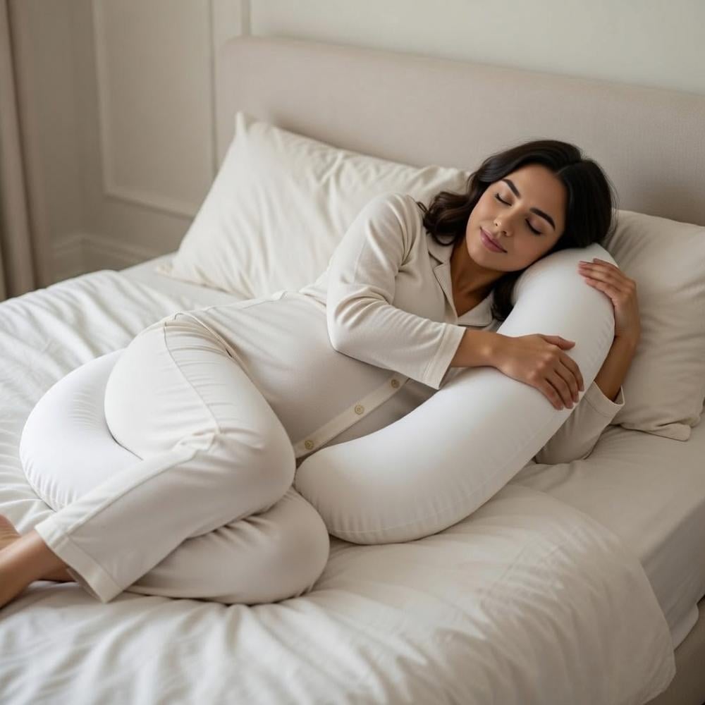 مصممة تفيد الاستخدام لدعم الجسم أثناء فترة الحمل والرضاعة ، تأخذ شكل البطن حتى مع تقدم الأشهر تناسب جميع وضعيات النوم بفضل تصميمها الانسيابي توفر دعم مثالي للبطن والظهر معاً .